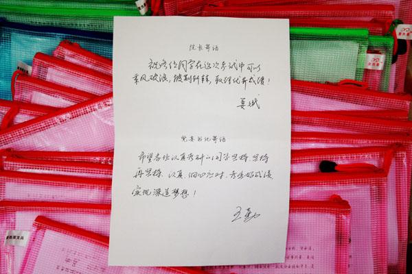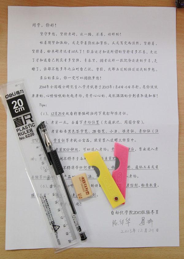 200多份爱心文具袋,包含一支黑色签字笔、一把小刀、一块橡皮、一把直尺、一封《致10级考生的信》及学院院长姜斌教授和党委书记王勤教授亲笔撰写的深情寄语,内容不多但心意满满。