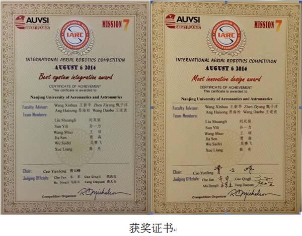 大赛包括室内研讨、技术答辩、静态评判、现场比赛等环节,四天时间里,各参赛队进行了飞行器设计、精确导航、自主控制等方面的精彩展示。我校betway西汉姆联王新华副教授和甄子洋副教授等指导的研究生团队(孙一力、王硕、贾森、薛亮、吴赛飞等)自主研制的六旋翼无人直升机飞行器自主完成了自主起飞着陆、目标机器人跟踪、室内避障等一系列规定动作,以优异的表现荣获该项赛事两项大奖:Most innovative design award(最佳创新设计奖)和Best system integration award(最佳系统集成奖)。