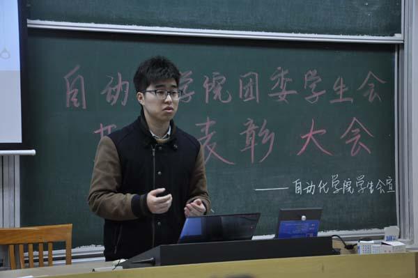 院学生会主席尤一韦首先上台发言,他对大家半年的工作和取得的成果做出肯定。他提出学院团委学生会要向服务型学生组织转型,在完成工作的同时每个人要有更多维度和更高层次的思考,不能仅停留在完成任务的层面;院团委学生会的众多部门虽然有分工和差异,但只要部门成员对各自部门的核心职能有足够的认识,就能更好的完成学生工作。最后他建议大一大二的同学在成长过程中要多读书,多和有经验的前辈们交流。