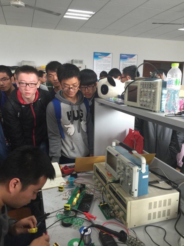 肖老师在电气楼511为同学们深入浅出地介绍了电气工程及其自动化专业发展方向和前景,并进行现场答疑,会场氛围活泼轻松。肖老师鼓励同学主动与他人交流,为学生的生活、学习、感情和未来发展问题提出了全方位的建议。散会后,肖老师带领学生参观电气实验室,鼓励学生主动钻研,致力科研。实验室里,同学们对科研设备感到十分新奇,也兴致勃勃地观摩了肖老师现场指导研究生进行调试的过程,激发了极大的科研热情。最后,大家在实验室合影留念。