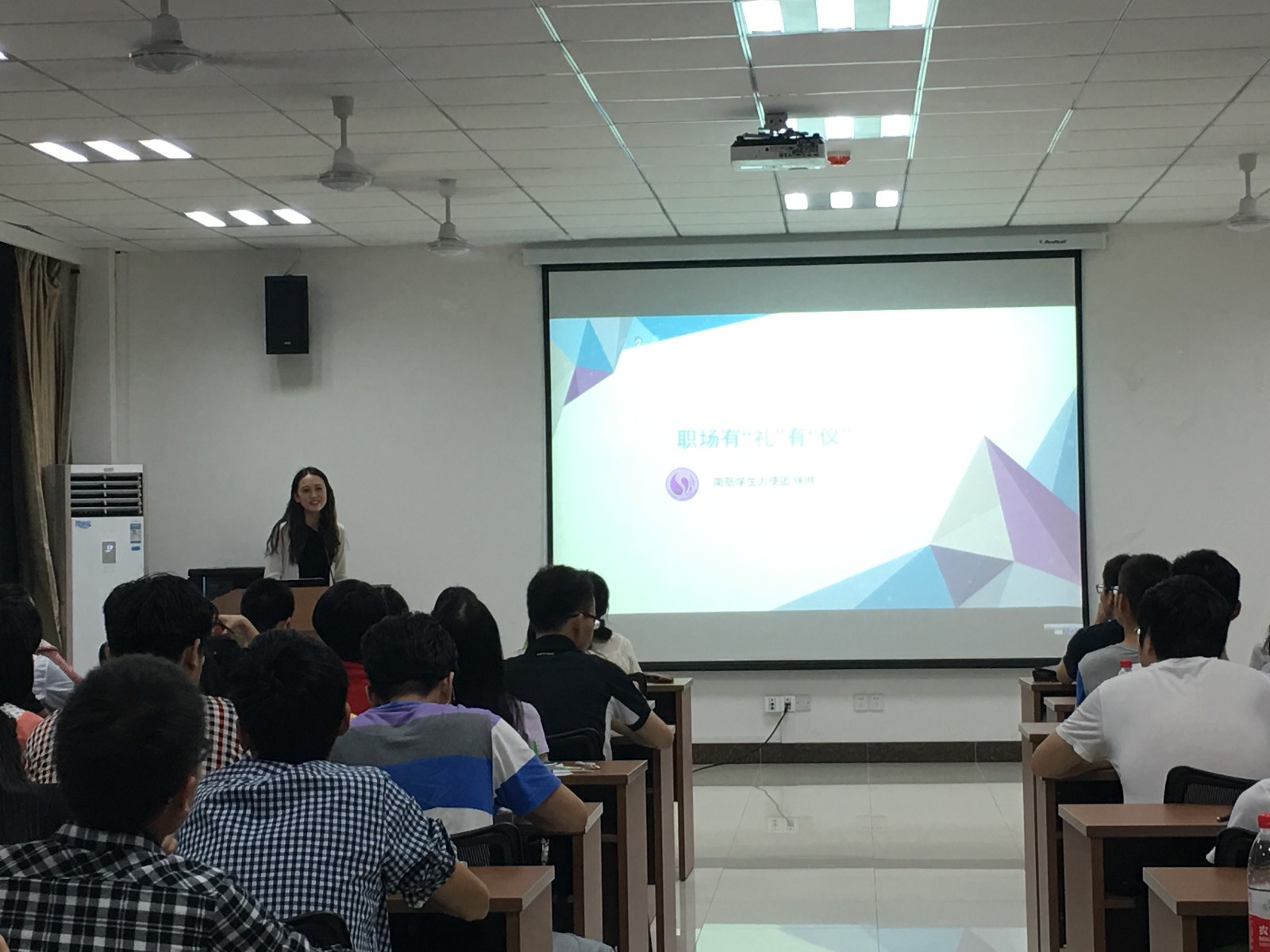 5月30日晚7点,本科2013级在将军路校区betway西汉姆联1号楼303报告厅举办职场礼仪培训讲座。讲座邀请了大使团礼仪队的两位同学,从面试礼仪、面试服装和化妆技巧三个方面指导2013级的同学们如何在职场中做到有“礼”有“仪”。