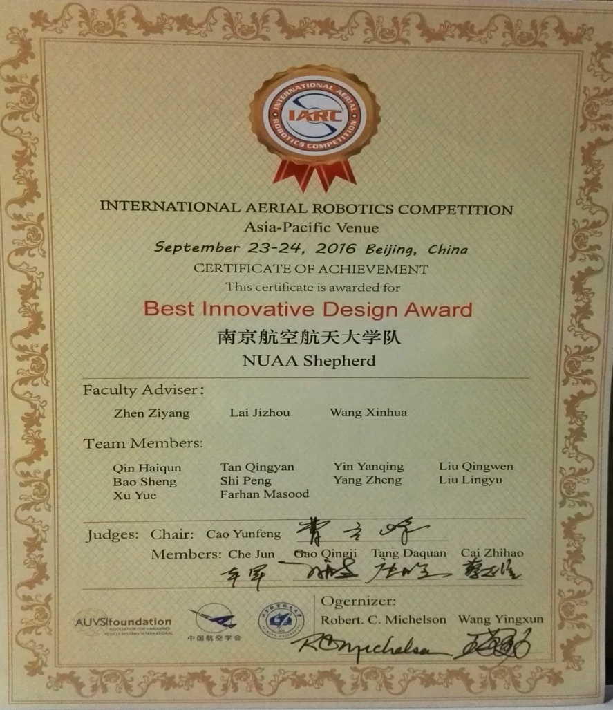 大赛包括技术答辩、静态评判、现场比赛等环节,进行飞行器设计、精确导航、自主控制等方面的创新技术展示。由betway西汉姆联甄子洋副教授、赖际舟教授和王新华副教授等指导的研究生团队(覃海群、谈青艳、尹彦卿、刘青文、包胜、石鹏等)自主研制的六旋翼无人飞行器完成了自主起飞着陆、目标机器人跟踪、室内避障等一系列规定动作,以优异的表现荣获该项赛事的Best Innovative Design Award(最佳创新设计奖)。我院已是连续第三年代表学校参加此项赛事,每年都取得了优异成绩。