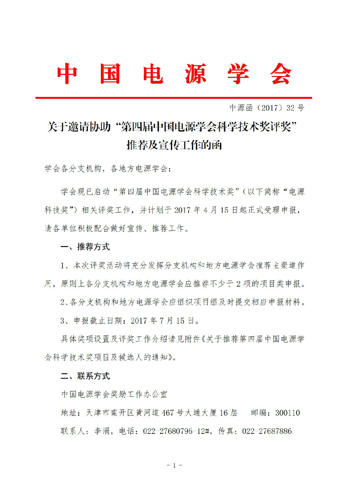 中源函(2017)32号-关于邀请协助“第四届中国 电源学会科学技术奖评奖”推荐及宣传工作的函.pdf