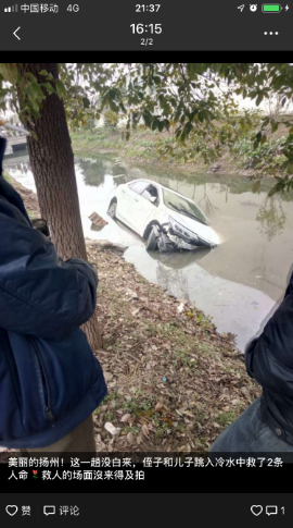 2月5日大年初一,在扬州广陵区头桥镇安阜村发生这样暖心的一幕:23岁的我院18级研究生高宇回乡探亲,看见汽车翻车掉入河里,他毫不犹豫地脱下羽绒服,跳进冰冷的河水中救人。