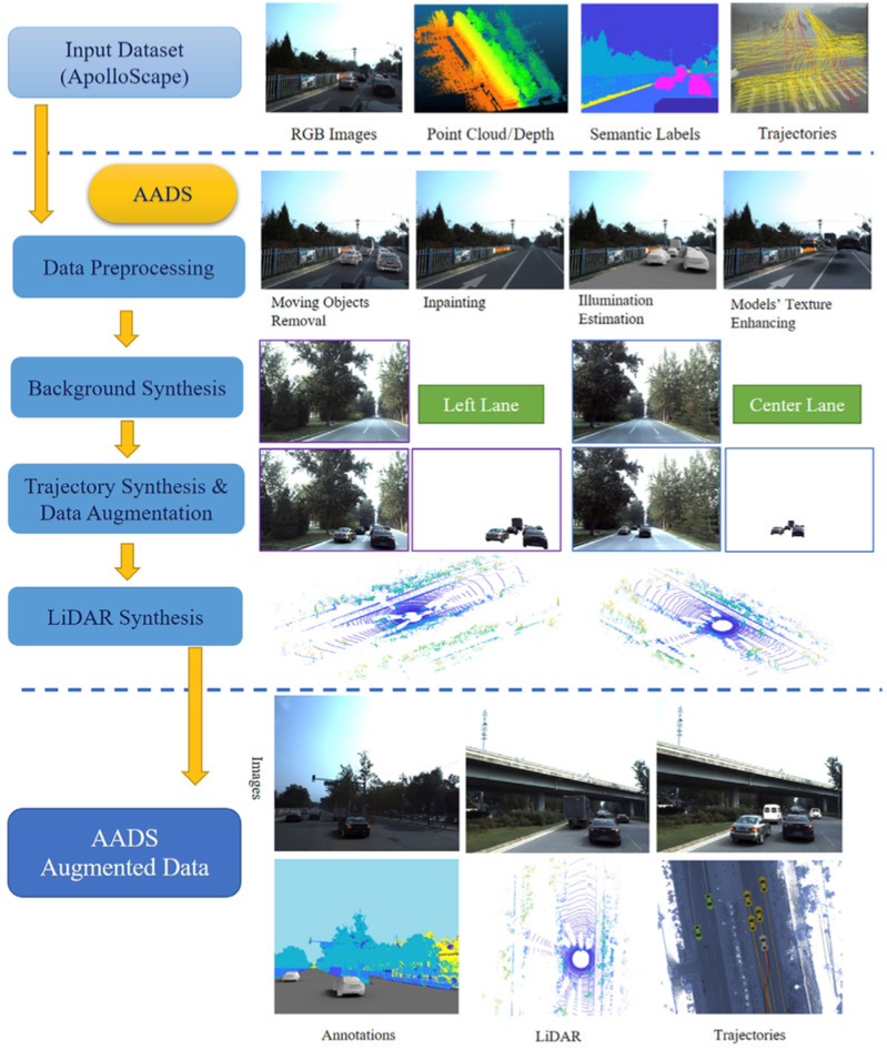 AADS 系统的输入、处理流程和输出。上:真实采集的数据集输入。虚线之间显示了 AADS 仿真系统的主要处理流程,包含数据预处理、虚拟背景合成、轨迹合成、移动目标的增强和 LiDAR 模拟。下:AADS 系统的输出,包含合成的 RGB 图像、LiDAR 点云和带有标注信息的车辆行驶轨迹。