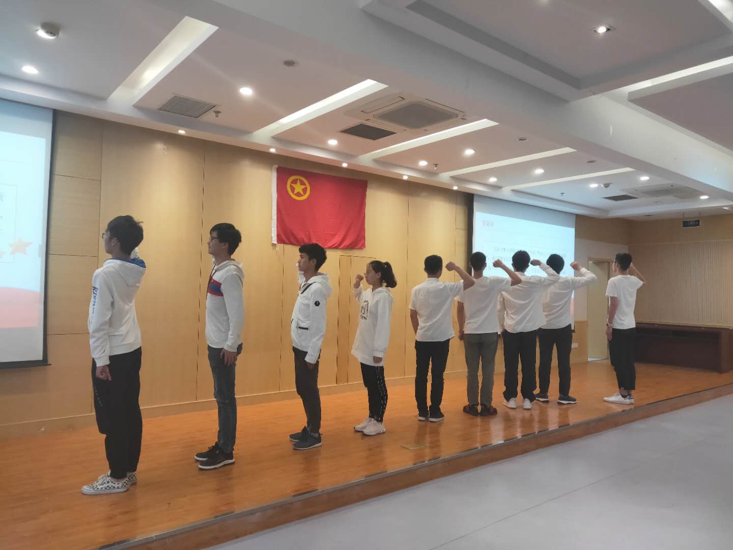 2019年4月28日下午四点,betway西汉姆联举办“新青年与五四运动”素养公开课暨新团员入团仪式,betway西汉姆联团委书记刘斐文、2017级本科生辅导员侯新闻、2018级本科生辅导员杨兴旺、汪明锐以及各班班长及团支书参加了本次活动。活动初始,学院为8名新入团团员举办了入团仪式,老团员为新团员佩戴了团徽并带领新团员进行了宣誓。