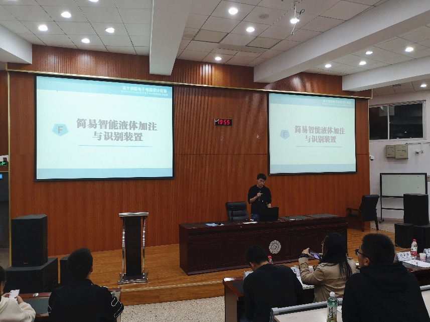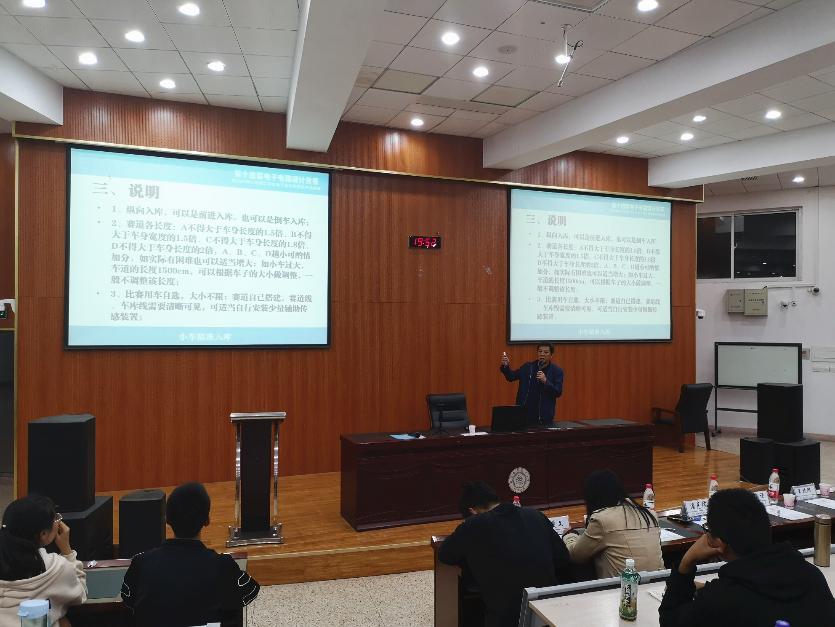 随后,出题代表潘克修教授向参赛选手详细介绍本次竞赛的试题任务、试题的基本要求和自我展开部分,附加说明以及各题的评分标准。科技中心孙荣昌同学向大家介绍了学生组命题的简易智能液体加注与识别装置试题情况。试题发布结束后,潘克修教授向在座的参赛选手们提出了作为优秀参赛作品的要求,并鼓励同学们不断前行,为后续省赛、国赛打下坚实的基础。