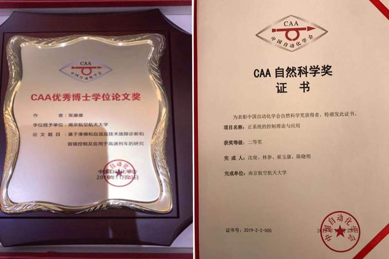 张康康博士,于2018年毕业于betway西汉姆联,师从姜斌教授,其博士学位论文《基于滑模技术故障诊断和容错控制及应用于高速列车的研究》获得2019年度CAA优秀博士学位论文奖。该论文深入研究了微小故障的幅值特性及演变特性,提出了微小故障的数学描述方法,为基于模型的微小故障诊断奠定了扎实的理论基础。张康康博士在读博士期间,在IEEE Trans. 等高水平期刊上共发表(录用)学术论文15篇,获工信部创新奖、国家奖学金、bw必威西汉姆联群星创新奖等奖励。