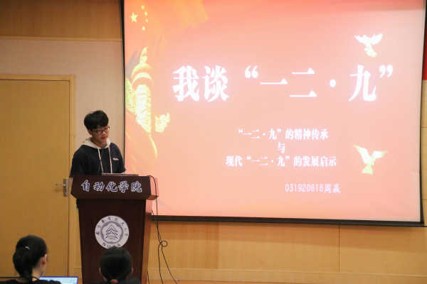 0319206团支部的周赢同学,深入分析了一二九的精神传承和发展启示,并重申了习近平总书记对新青年的六点要求。0319104团支部的张前同学,从改革开放以来我国社会主义现代化建设谈起,让同学们对中国特色社会主义道路自信、制度自信、理论自信、文化自信四个自信有了更深层次的理解。0319105团支部的杨诗婧同学首先谈到国家的初心、初心的含义,以及作为新时期团员为什么坚守初心及怎样坚守初心。0319201团支部的王敬怡同学,从中国特色社会主义道路的本质谈起,结合历史,就青年担当和新青年如何爱国三个方面进行了讲解。