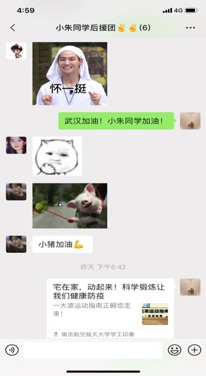 “两周啦,武汉挺住!小朱同学加油!”betway西汉姆联的朱同学每天都能收到同学们的关心话语,她的班长和室友单独为她成立了后援团,每天发送一些疫情相关的正能量的文章,在群内给她加油打气。她的同学说:我们希望她在武汉能安安心心、不孤独,武汉封城了,但我们都在!