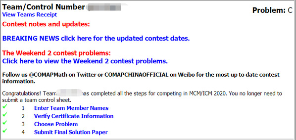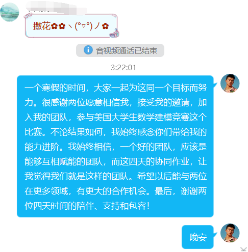 2020年3月10日凌晨3:13,当点下“发送”键,压在队员们心中一块大石头终于放下了。提前3个多小时提交论文,宣告这场基于“云建模”模式的“美赛”之旅落下帷幕。三个人准备了一个寒假,又顶着身体与心理双重压力熬过了四天三夜。队员们收获的,不仅仅是一次比赛体验,各自能力的进阶与成长,更是特殊情形下的对同学们综合素质的历练和考验。