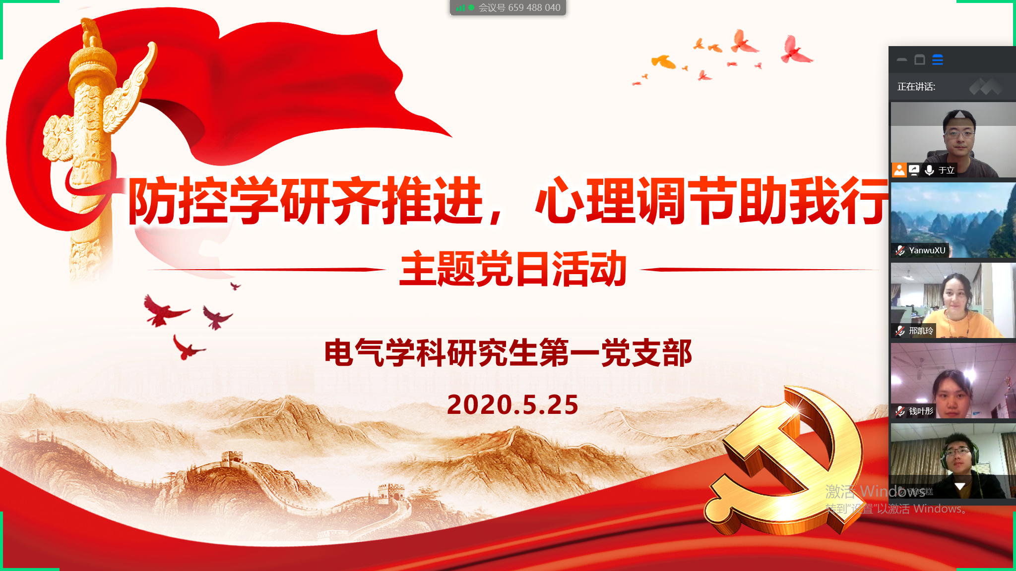 全国两会的顺利召开,展示了党中央、国务院统筹抓好疫情防控和经济社会发展的坚强决心,极大鼓舞了全国上下团结一致、共克时艰的信心和勇气。betway西汉姆联电气学科研究生第一党支部全体师生热切关注全国两会的召开,结合研究生自身疫情防控与研学生活中的心理调控方式方法,5月25日,第一党支部开展了一场以“防控学研齐推进,心理调节助我行”为主题的线上党日活动。支部党员、发展对象、积极分子共计28人参加了本次活动。