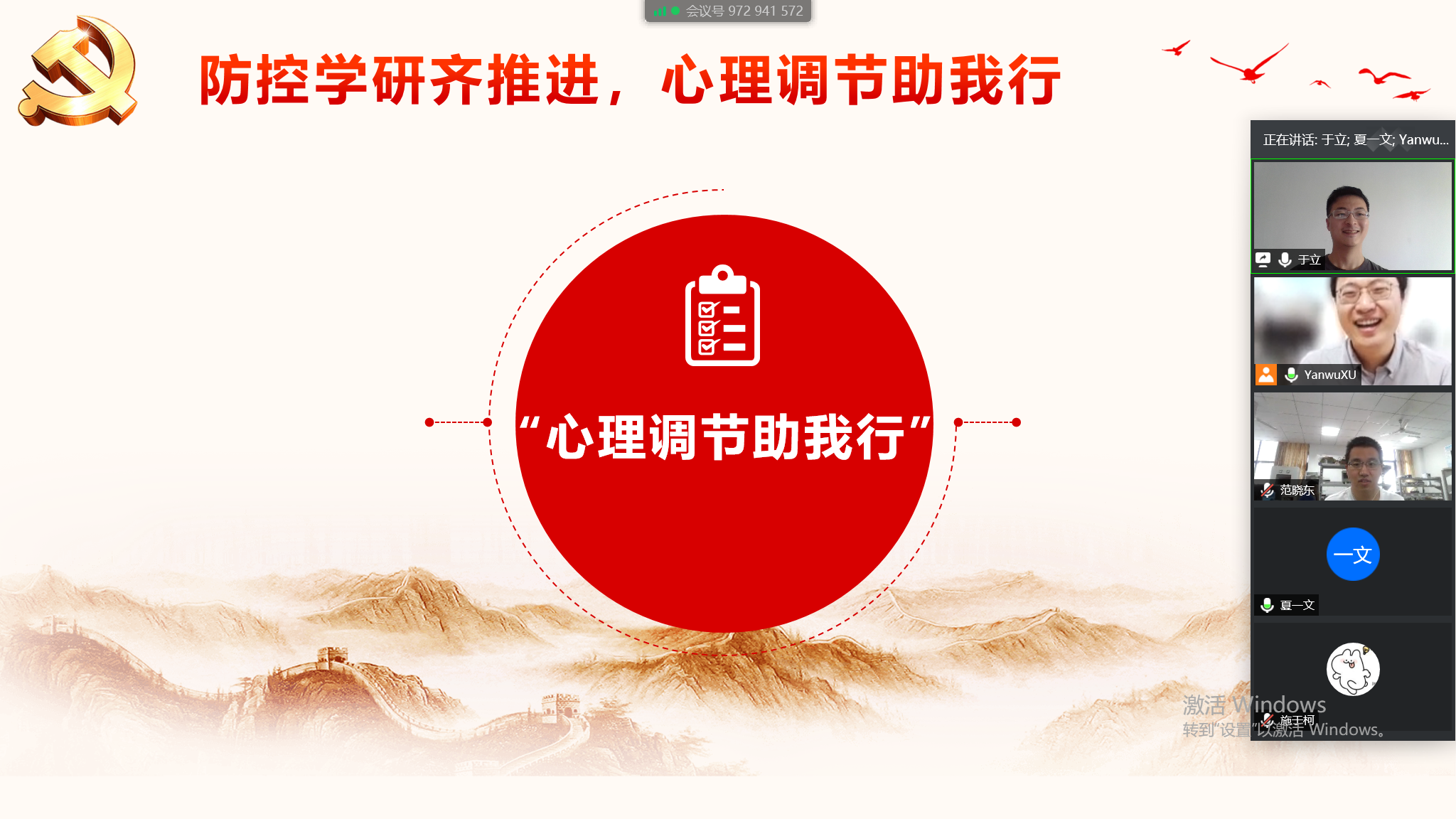 随后,党支部副书记钱叶彤同志组织支部成员热烈讨论,许彦武等同志围绕自身在疫情防控与科研学习两个战场上的心路历程与心理调节过程热烈发言。于立同志为大家主讲了疫情防控期间,研究生学习生活中心理建设的重要性及心理调控方式方法。本次活动让同学们对国际国内的形势有了进一步的了解,增强了同学们抗疫的信心,提升了同学们战胜困难的勇气。
