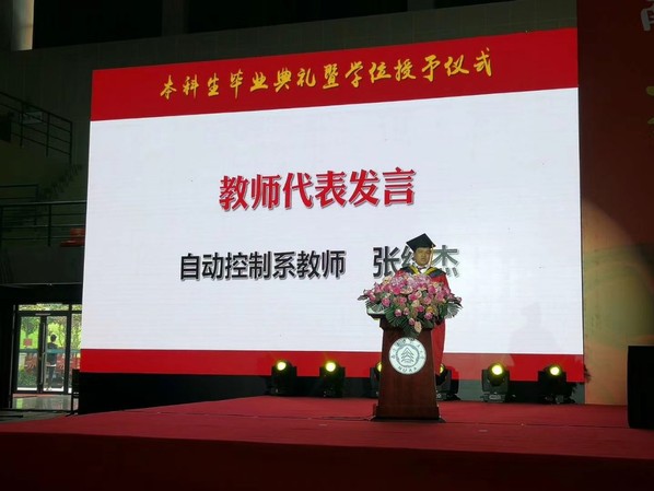 在教师代表发言环节,自控系张绍杰老师代表betway西汉姆联全体教师发言。他希望大家要养成终身学习的习惯,要不忘初心,永葆情怀,要养成良好的习惯,保持身心健康。