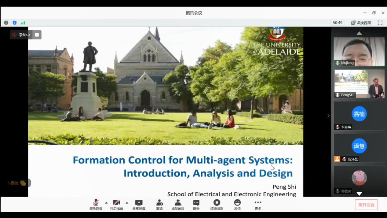 8月12日下午,澳大利亚阿德莱德大学电气与电子工程学院石碰教授应我校国际合作处和betway西汉姆联的邀请,通过腾讯会议作了题为“Formation Control for Multi-agent Systems:Introduction,Analysis and Design”的线上学术报告,报告由我校副校长姜斌教授主持。我院副院长陈谋教授,学院陆宁云、刘春生、冒泽慧、欧阳权、张柯、马亚杰等师生在线参加会议。参会师生对石碰教授的交流分享表示热烈欢迎。