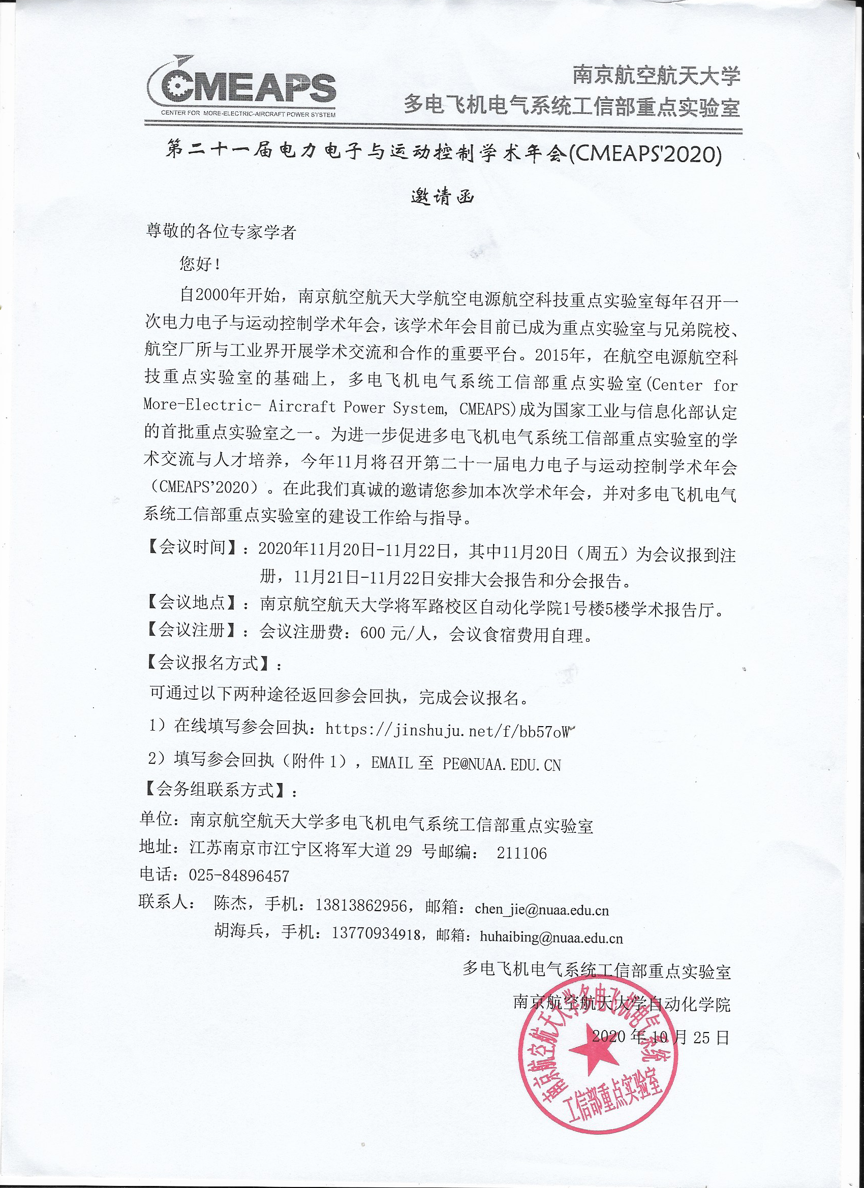自2000年开始,bw必威西汉姆联航空电源航空科技重点实验室每年召开一次电力电子与运动控制学术年会,该学术年会目前已成为重点实验室与兄弟院校、航空厂所与工业界开展学术交流和合作的重要平台。2015年,在航空电源航空科技重点实验室的基础上,多电飞机电气系统工信部重点实验室(Center for More-Electric- Aircraft Power System, CMEAPS)成为国家工业与信息化部认定的首批重点实验室之一。为进一步促进多电飞机电气系统工信部重点实验室的学术交流与人才培养,今年11月将召开第二十一届电力电子与运动控制学术年会(CMEAPS’2020)。在此我们真诚的邀请您参加本次学术年会,并对多电飞机电气系统工信部重点实验室的建设工作给与指导。