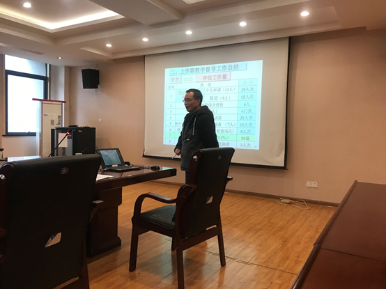 学院督导组组长潘双来代表学院督导组从督导工作的各个方面进行了详细的工作总结和情况交流。潘老师首先汇报了上一学期督导工作安排和检查结果,指出了团队课程建设和教师投入程度的重要性。对抽查结果中存在的问题进行了细致的分析,从学困生指导、重修班模式优化、青年教师成长等方面提出了很多切实有效的建议。