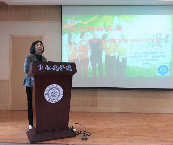 随后,宋晓峰副院长介绍了贺丹军主任的学术生涯与学术成果,并对贺丹军主任的到来表示热烈的欢迎。贺丹军主任作题为《校园情绪管理——大学生心理障碍识别与处置》的专题报告。她结合自己的临床经验,详细介绍了忧虑、焦虑、躯体症等大学生心理障碍的识别方法、正确的处置办法和预防措施,提供了大学生心理健康自行检测的两种量表和治疗建议。她指出,大学生心理障碍只是一种病,需要及时发现,正确对待,科学合理治疗。