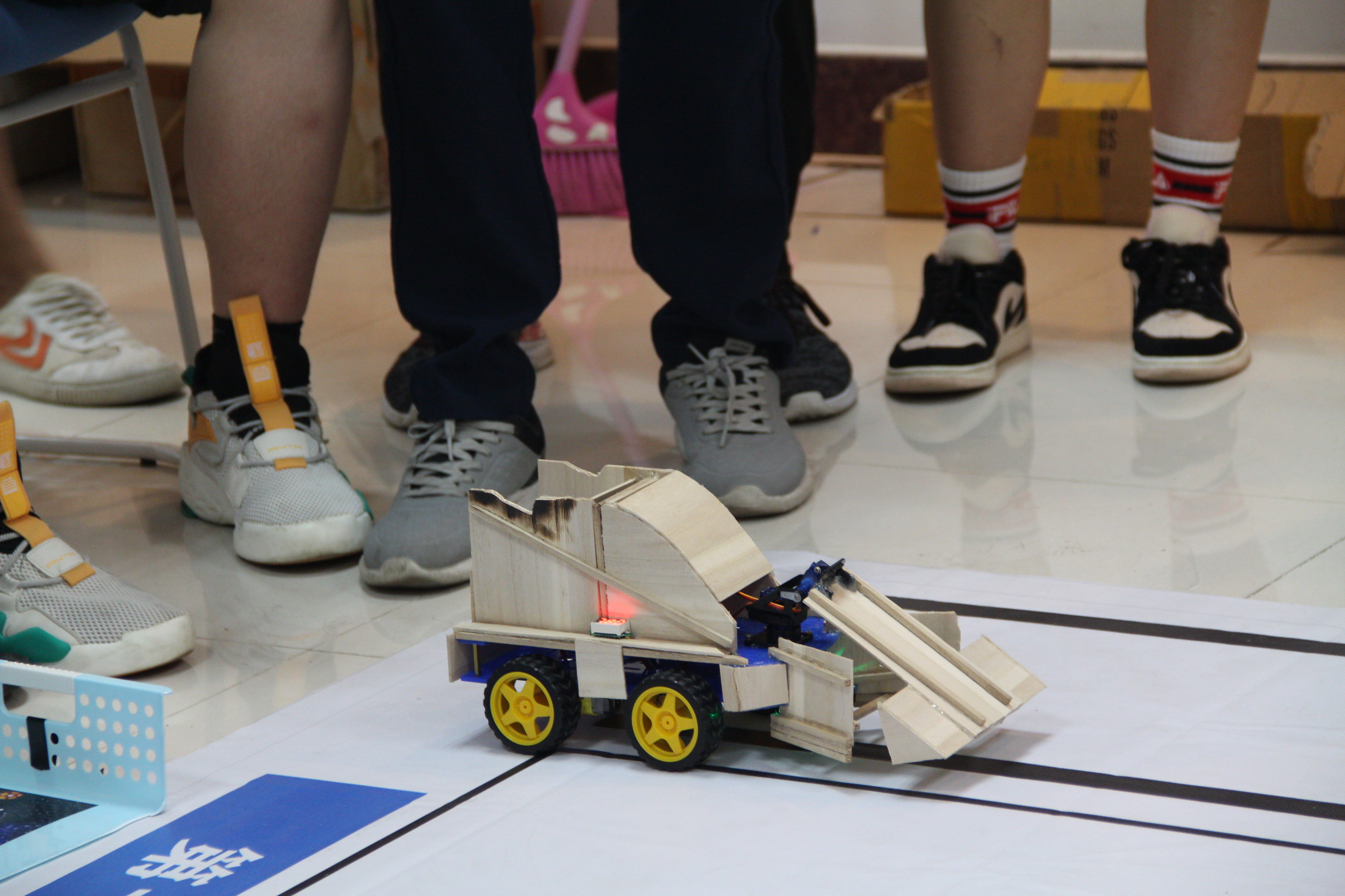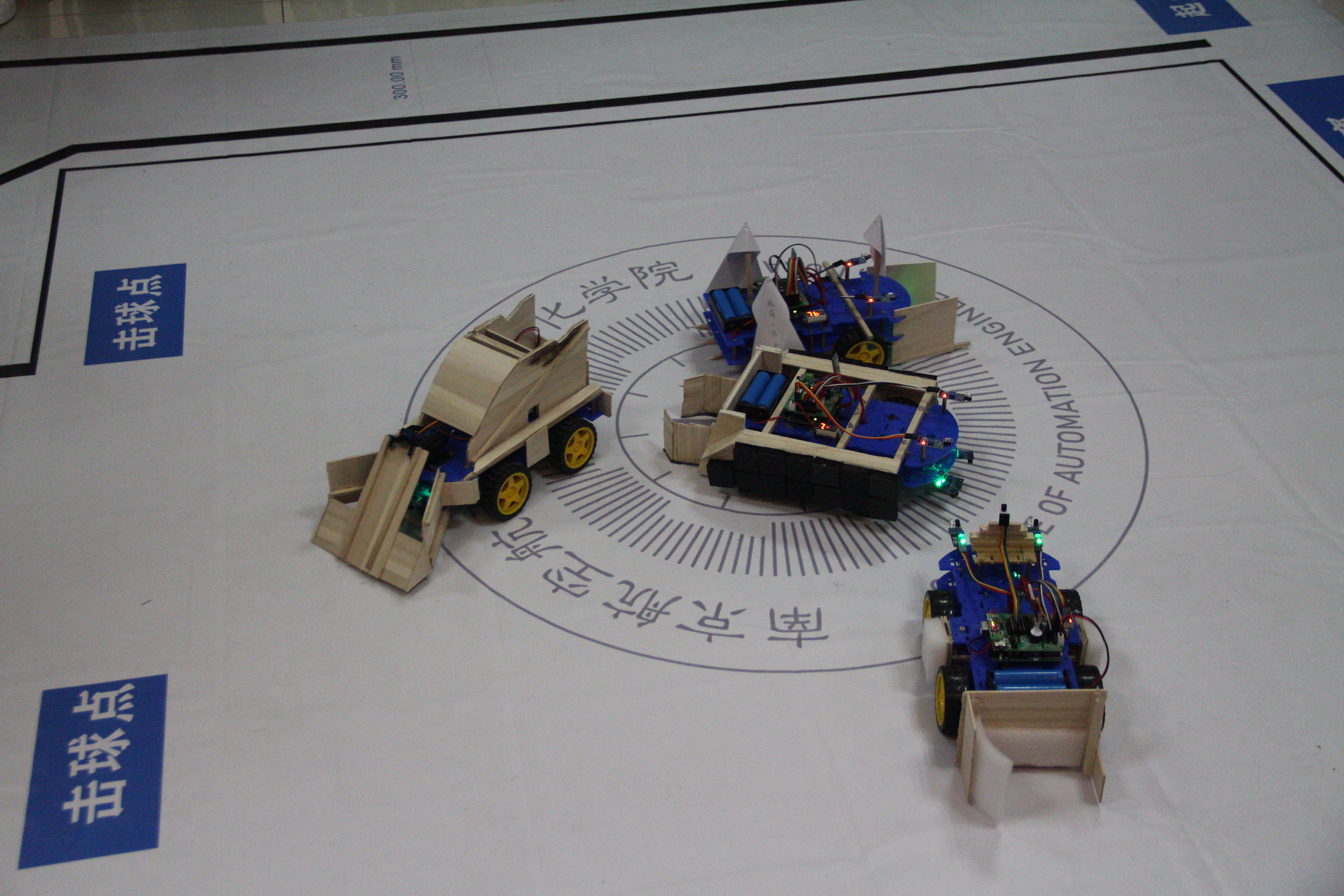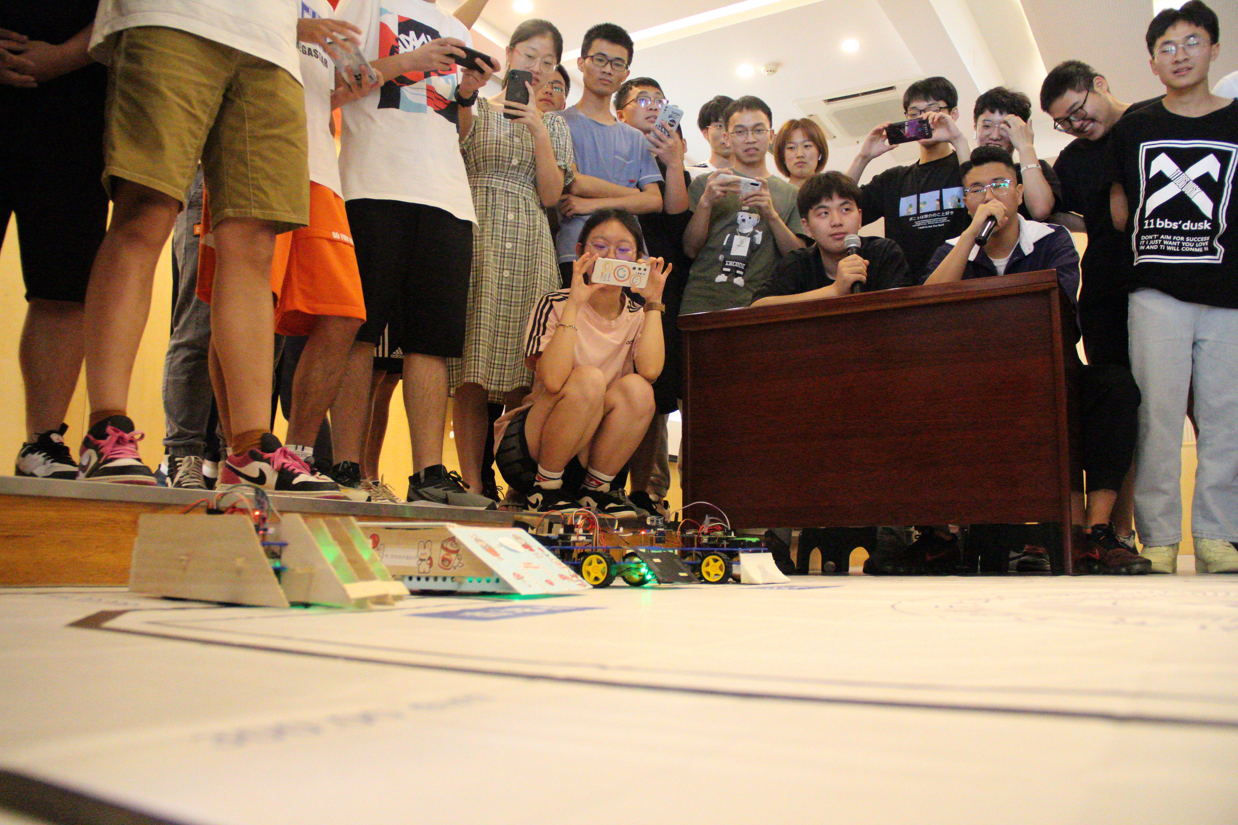 随后,主持人介绍比赛规则和流程后,比赛正式开始。本次比赛共收到全校共39支队伍、169名同学报名参赛,最终共27支队伍完成作品并参与最终决赛。决赛内容由循迹,定点击球和对抗三部分构成。其中对抗赛部分尤其精彩,各支参赛队伍为了让自己组的作品攻守兼备都绞尽脑汁,进行了各种加装,诞生了许多优秀的创意作品。同时比赛场上风云万变,各种精彩瞬间层出不穷引得观众阵阵喝彩,再加上解说们的精彩解说,现场气氛十分热烈。
