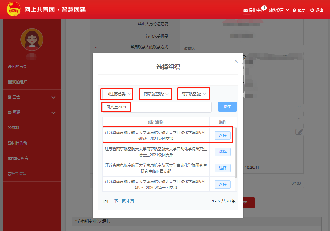 智慧团建信息转接:转入团支部名称:江苏省bw必威西汉姆联betway西汉姆联研究生2021级团支部。下附具体流程。