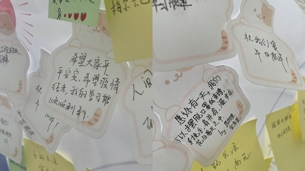 留言板上数十条留言勾勒出疫情期间同学们的美好祝愿和生活热情。既有“希望大家平平安安,疫情早点结束”,“手挽手,肩并肩,漫步在花与春天之中”,这样的美好祝福,又有“我想吃汉堡”、“早日脱单”之类的朴素愿望,还有“门卫叔叔、食堂阿姨你们辛苦了”等对疫情期间工作人员的感谢。