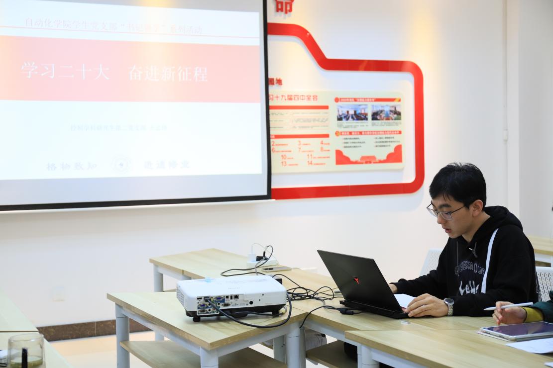 控制学科研究生第二党支部副书记王志伟做专题分享《学习二十大,奋进新征程》。王志伟对党的二十大报告条分缕析,围绕中国共产党的中心任务,以C919研究团队为例,勉励大家要发扬不畏艰苦的斗争精神,为全面建设社会主义现代化国家、全面推进中华民族伟大复兴而团结奋斗。一代人有一代人的使命,一代人有一代人的担当。王志伟从“最是信仰坚如磐,以劈波斩浪之姿立潮头。”、“最是担当见真章,以闯关夺隘之姿争先锋。”和“最是枝叶总关情,以奉献为民之姿担使命。”三个方面讲述新时代青年的使命与担当。