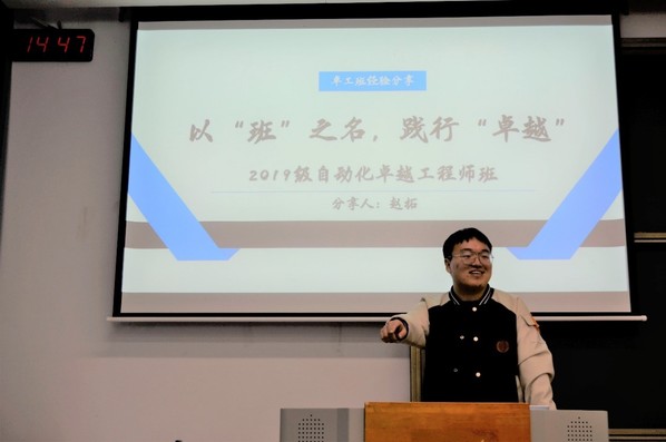 2019级卓越班班长赵拓同学分享了班级学习和建设情况, 2019级卓越班同学和班级先后获得国家级、省部级和校级奖励等多项荣誉,向新一届的卓越班同学们展示了卓越班追求“卓越”、践行“卓越”的精神,为同学们树立了榜样。