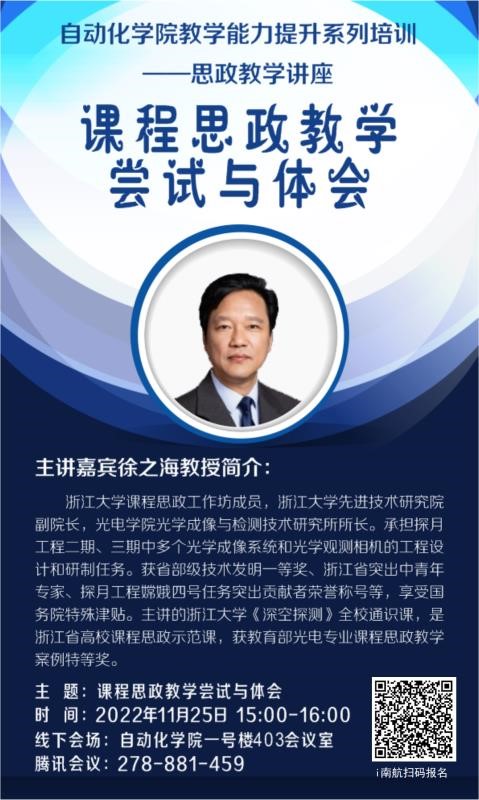 2022年11月25日下午,我院邀请到浙江大学徐之海教授作题为《“课程思政”教学尝试与体会》的线上专题讲座。本次讲座由betway西汉姆联副院长魏佳丹主持,学院党委书记李文雷、院长陈谋、各系所中心教学副主任、近三年入职青年教师和教学办全体老师出席活动。讲座采取线上、线下相结合的方式,全校50余名专任教师听取了报告。