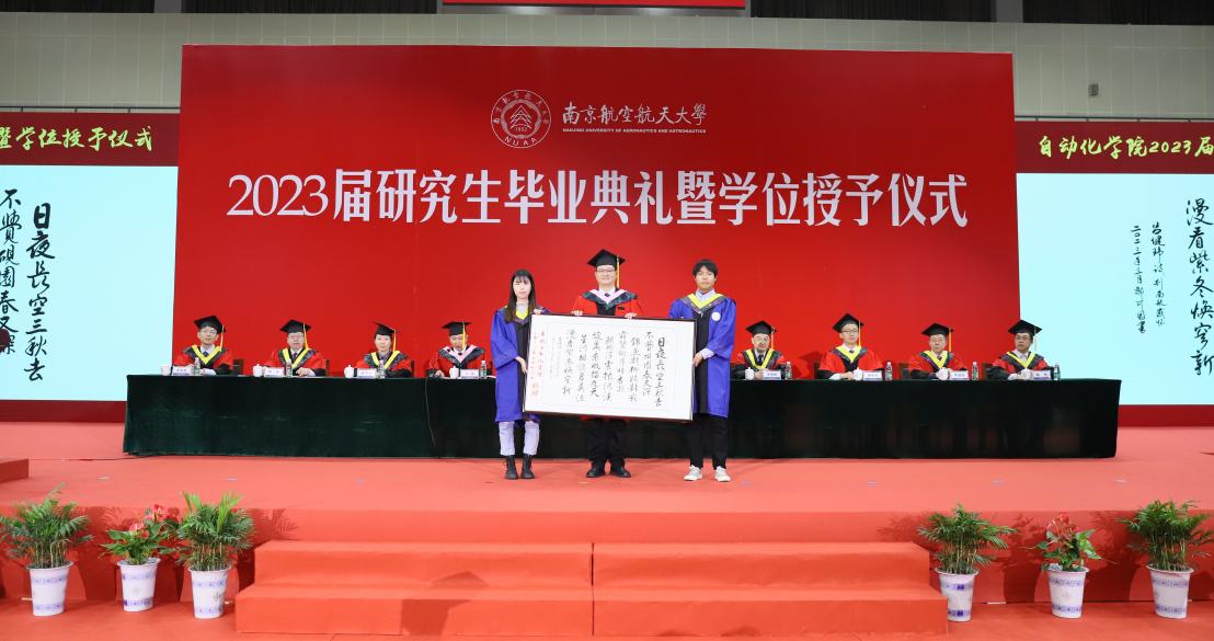 典礼上,两位毕业生代表向母院赠送集体礼物——一副吕健玮、邹可园两位同学创作的《别南航感怀》原创诗词书法作品,李文雷代表学院接受了这份来自毕业生的特殊赠礼,同时他也代表学院为毕业生代表赠送印有学院特色的纪念品,这些纪念品代表着学院希望大家牢记记格物致知,不断进德修业,志存高远,踔厉奋进,取得更高成就。