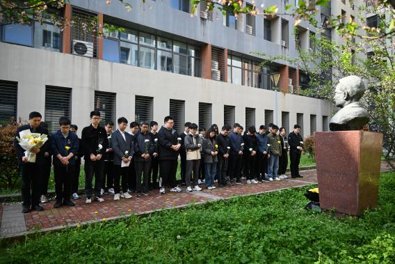 上午九点,全体师生手持黄、白两色菊花,面向丁道宏教授铜像肃立,默哀一分钟,集体鞠躬,向丁教授致以缅怀与敬意。