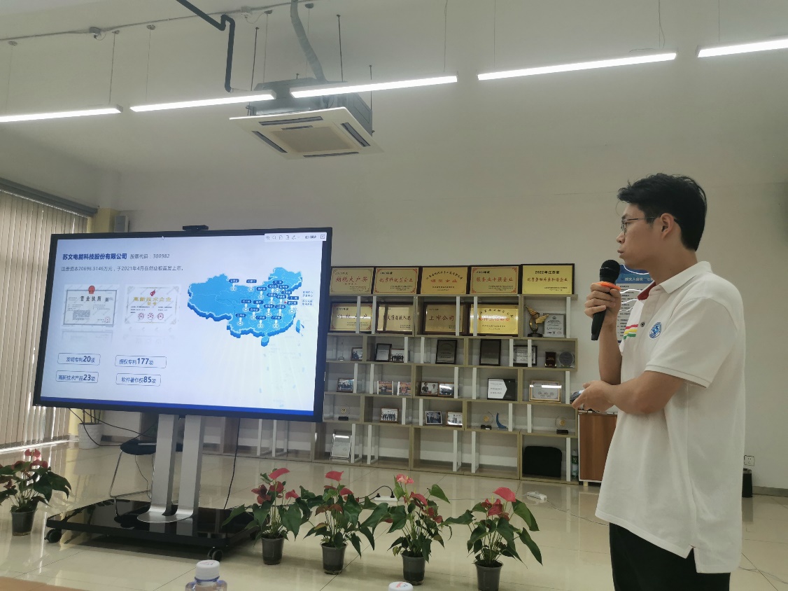 活动现场,我校22届优秀毕业生、苏文电能产品经理周斌从基本情况、所获荣誉和“1+5+6+7”运营体系等方面为同学们详细介绍苏文电能。他表示,苏文电能作为EPCOS一站式电能服务商,业务涉及电力设计咨询、电力设备制造、电力施工及智能用电服务等多个领域,期待更多优秀的南航毕业生能够加入团队。