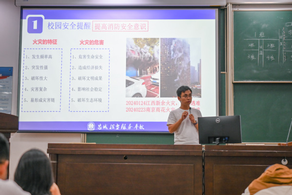 石振东从学校消防安全和网络防诈骗两个主题展开安全主题教育。他通过实际案例讲述火灾造成的人员财产伤害并指出同学们普遍存在的不良习惯,普及消防安全“四会”知识;也分析了网络诈骗的类型、危害和防范方法,强调要不贪、不自大、不转帐。