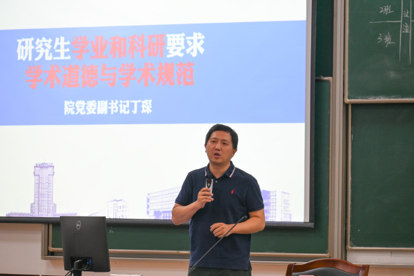 罗建文为同学们详细介绍了校规校纪、研究生日常管理规定、党员团员发展流程与常见信息获取渠道。他再次向同学们强调了要时刻保持安全意识和防诈骗意识,并动员同学们积极向党组织靠拢,坚定理想信念,时刻以党员的标准要求自己,心中有责任、有大爱、有国家。