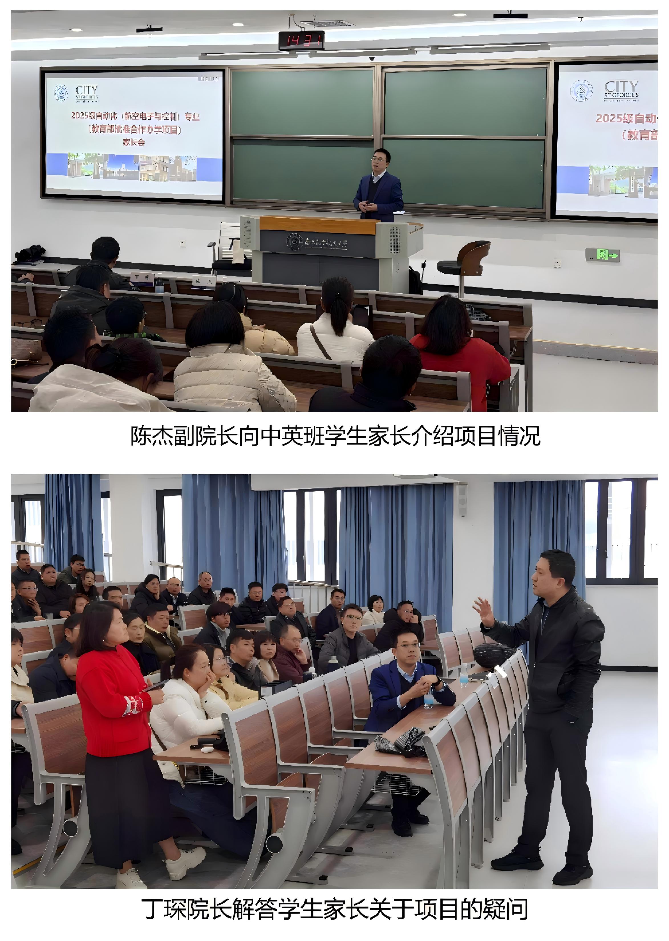 在交流环节,牧星学院致慧书院执行院长丁琛、自动化中英班专业负责人张绍杰老师解答了家长们最为关心的一系列问题,丁琛结合当前国内升学的激烈竞争形式指出,持有英方学位在国际上申请高层次学府具有无可比拟的优势,为学生提供了更加多元化、综合化的发展渠道。张绍杰老师向家长们详细介绍了在英国的学习生活情况和费用情况,让家长对项目的运行有了更深一步的了解。